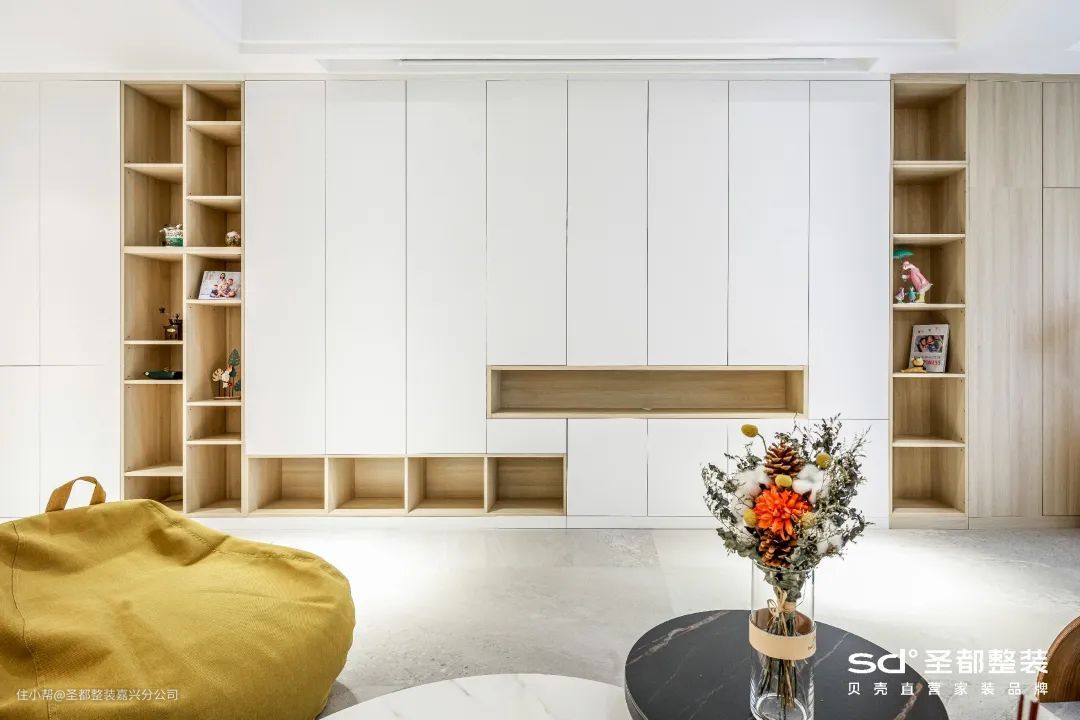 直接放弃观影要求,以整墙收纳柜铺满整个墙面,最大化实现空间收纳力。