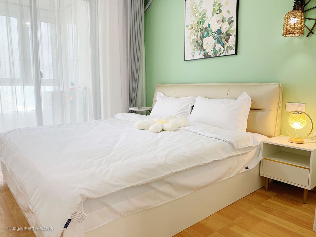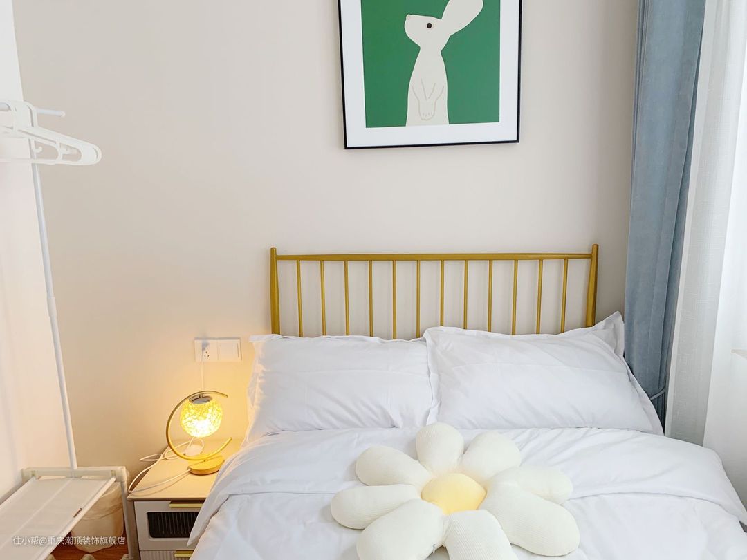 次的风格比较素雅,床头柜的设计,延续了整个空间的方正,收纳量也翻倍。大白墙+绿色艺术风挂画整体清醒自然