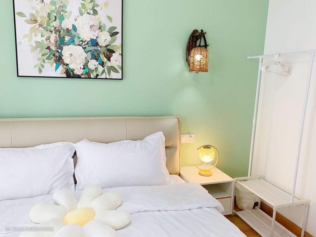 主卧整体以薄荷绿小清新为主,搭配花卉挂画和复古壁灯,与米白色软包床头形成对比做出层次感