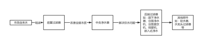 主要是由前置过滤器、中央净水机、末端净水器完成,前置过滤器主要过滤泥沙、铁锈等颗粒物,中央净水器主要是通过高纯度KDF滤料以及活性炭吸附净水,去除水中的余氯、胶体还有其他杂质等等,末端的净水器主要是通过RO-反渗透膜拦截除了水以外的各种杂质。