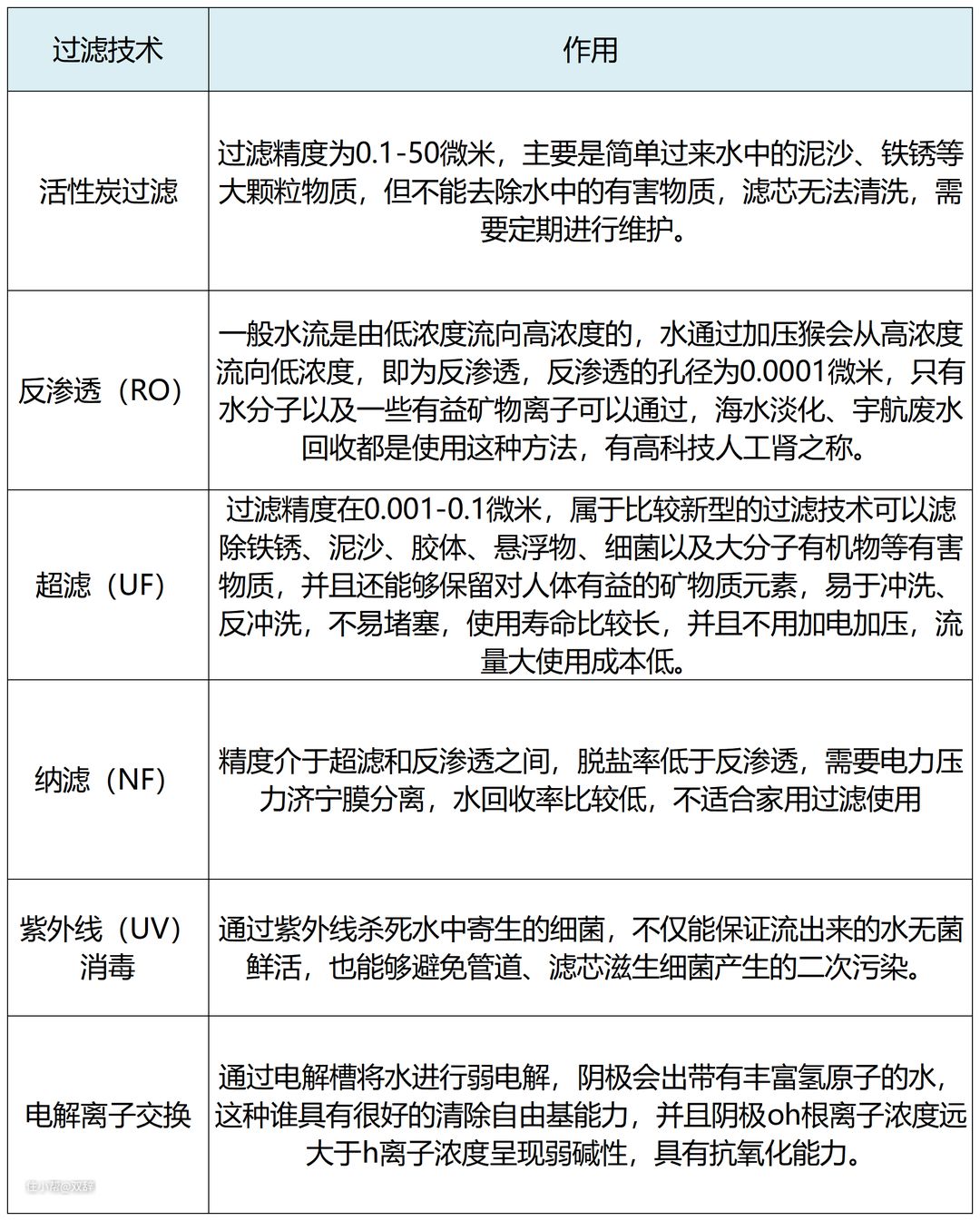 净水器的过滤技术主要包括活性炭过滤、反渗透过滤、超滤、纳滤、紫外线消毒、电解离子交换等技术,我把这几项技术的特点整理成一个表格,感兴趣的小伙伴可看看。