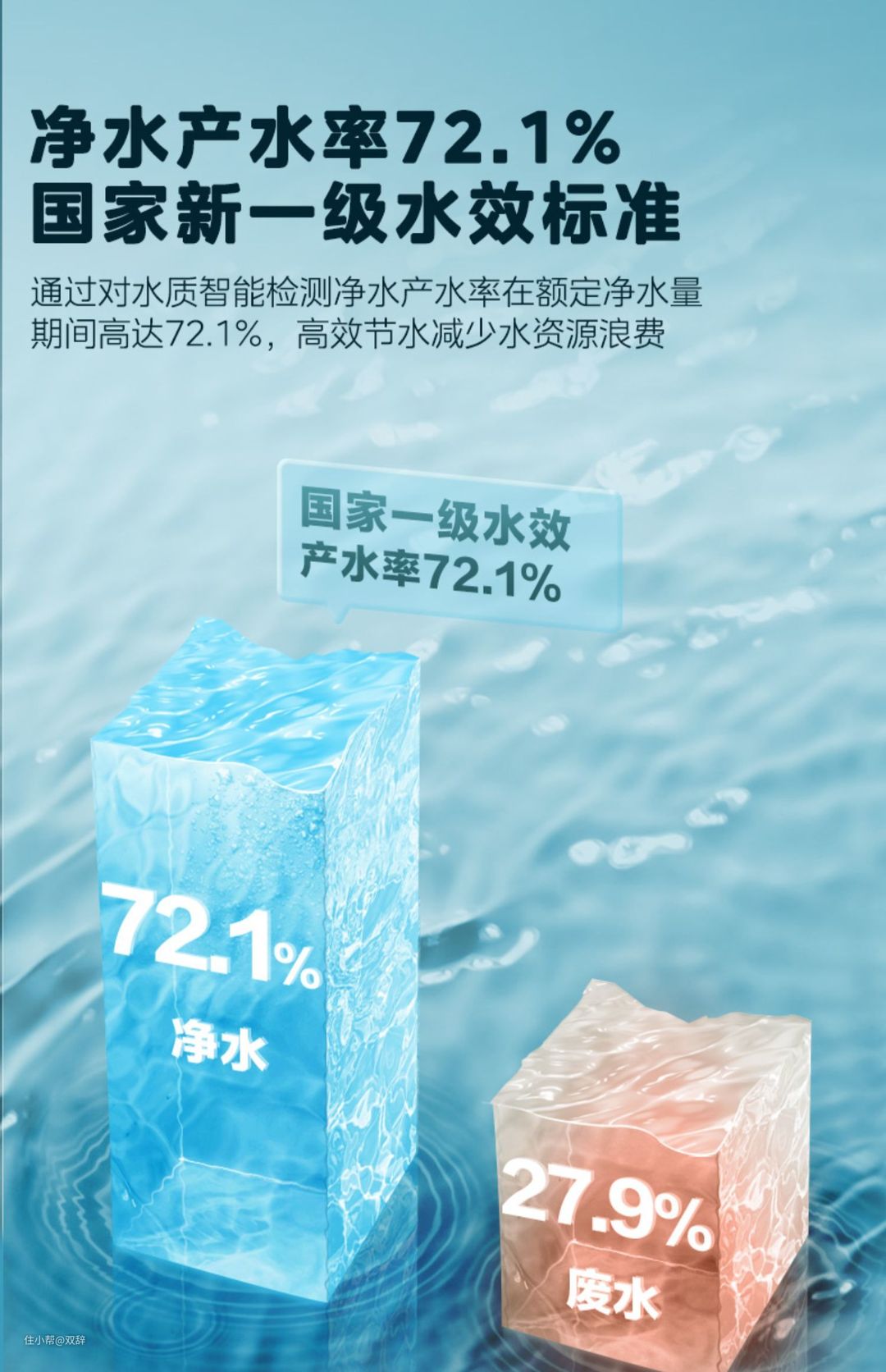 使用了RO反渗透的净水器是会有废水产生的,不同的产品产水率是不同的,比率越高越好,意味着对于原水的利用率越高,如果产水率为65%就说明100L的原水可以过滤出65L的纯水。产水率也与水效有关,目前三级水效的净水产水率为≥45%,二级水效净水产水率为≥55%,一级水效净水产水率为≥65%,也同样更建议大家优先选择等级更高的。