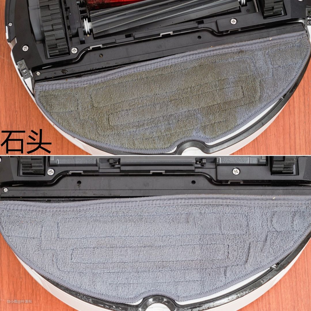 石头清洁效果也不错。基本上走一遍就把咖啡都拖干净了。不过水痕会比科沃斯明显一点,可能是因为它拖布比较薄,走得有点快,水还没充分被拖布吸走,机器人就走了,所以有一丢丢残留在了地面上。