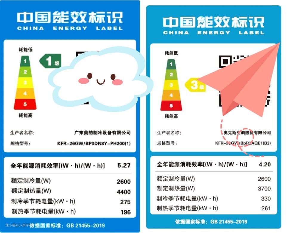 最后回答大家最关心的一个问题:一级能效,比三级能效省多少电?我们分别找到两款空调的能效等级标识▽