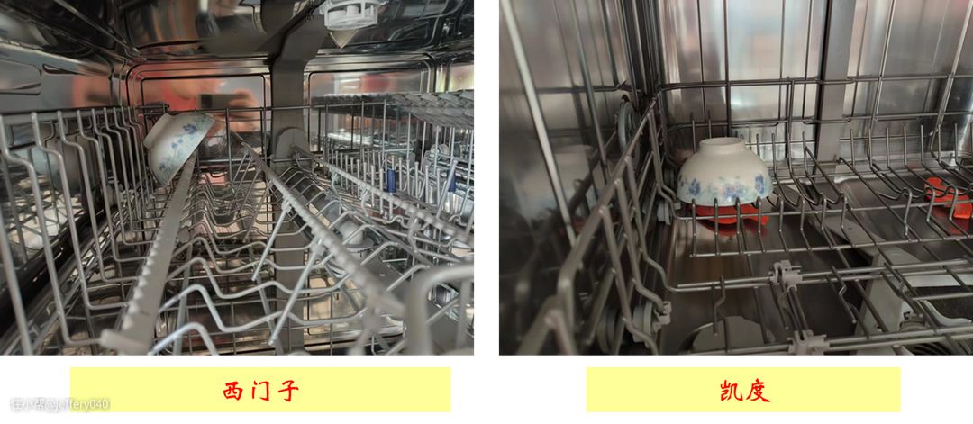然后是结果,挺意外的,一个很干净,一个还是有残留。左侧西门子和我之前家用的8套洗碗机结果类似,但是想不到的是凯度的却是直接洗干净了。我感觉还是有一个专门的喷头,不留死角,而且水压勾搭的情况下,对蒸蛋羹产生了毁灭性打击!