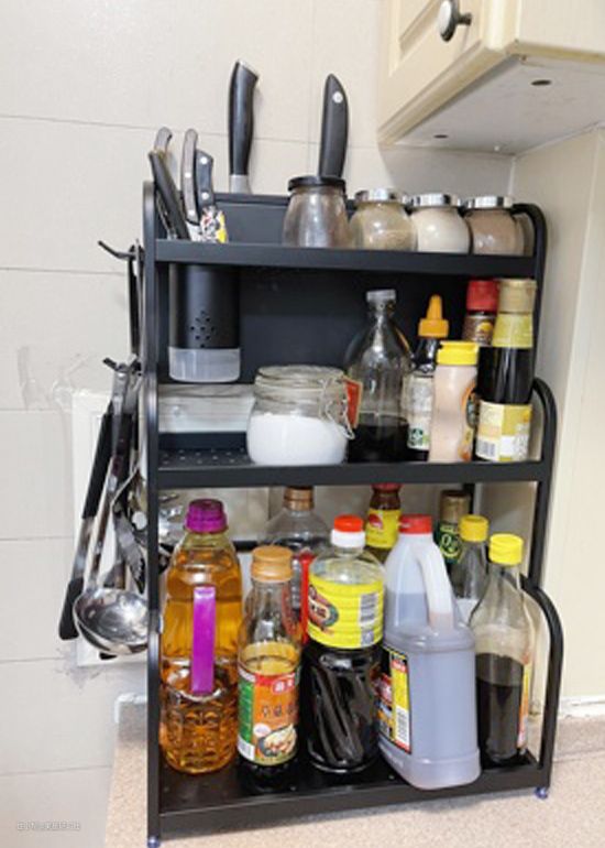 做菜常用的调料通常都会用置物架放在台面或挂在墙上,但这种置物架拿取不方便,因为放在背面的调料要拿出来,就要先把前面拿开。