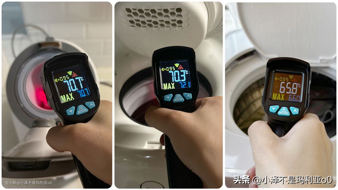 一般来说,用70℃以上的水温连续洗涤20min以上就能达到巴氏杀菌的效果,三款产品都宣称对金黄色葡萄球菌、白色念珠菌、大肠杆菌的除菌率可以达到99.99%,在实际的测试过程中也能看到它们的水洗温度差异其实并不大。