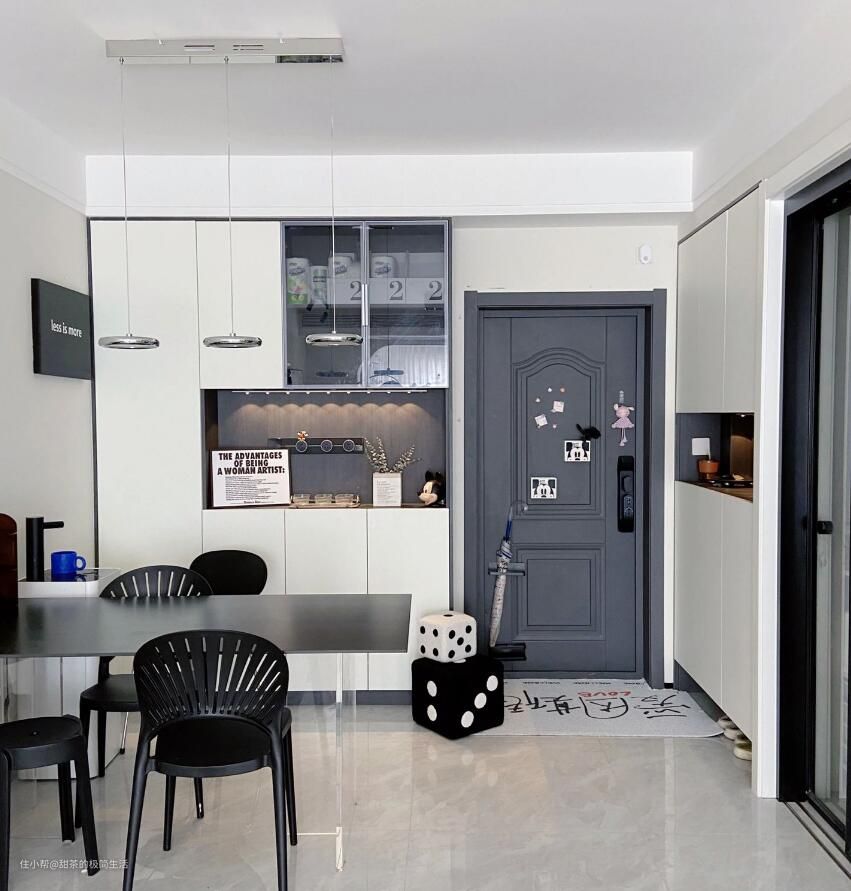 建面89㎡的小家,空间有限,没有独立玄关,进门就是餐厅,屋主把餐厅和玄关的功能做了合并。