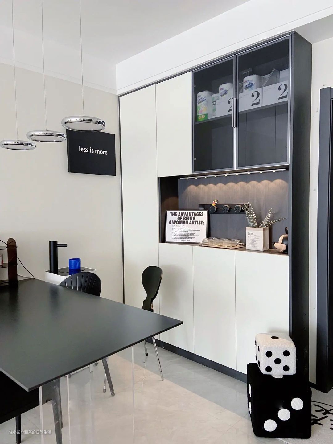 餐厅规划在进门后的另一侧,黑色简约风餐桌靠墙摆放,桌腿是亚克力材质的,视觉感轻盈又高级。