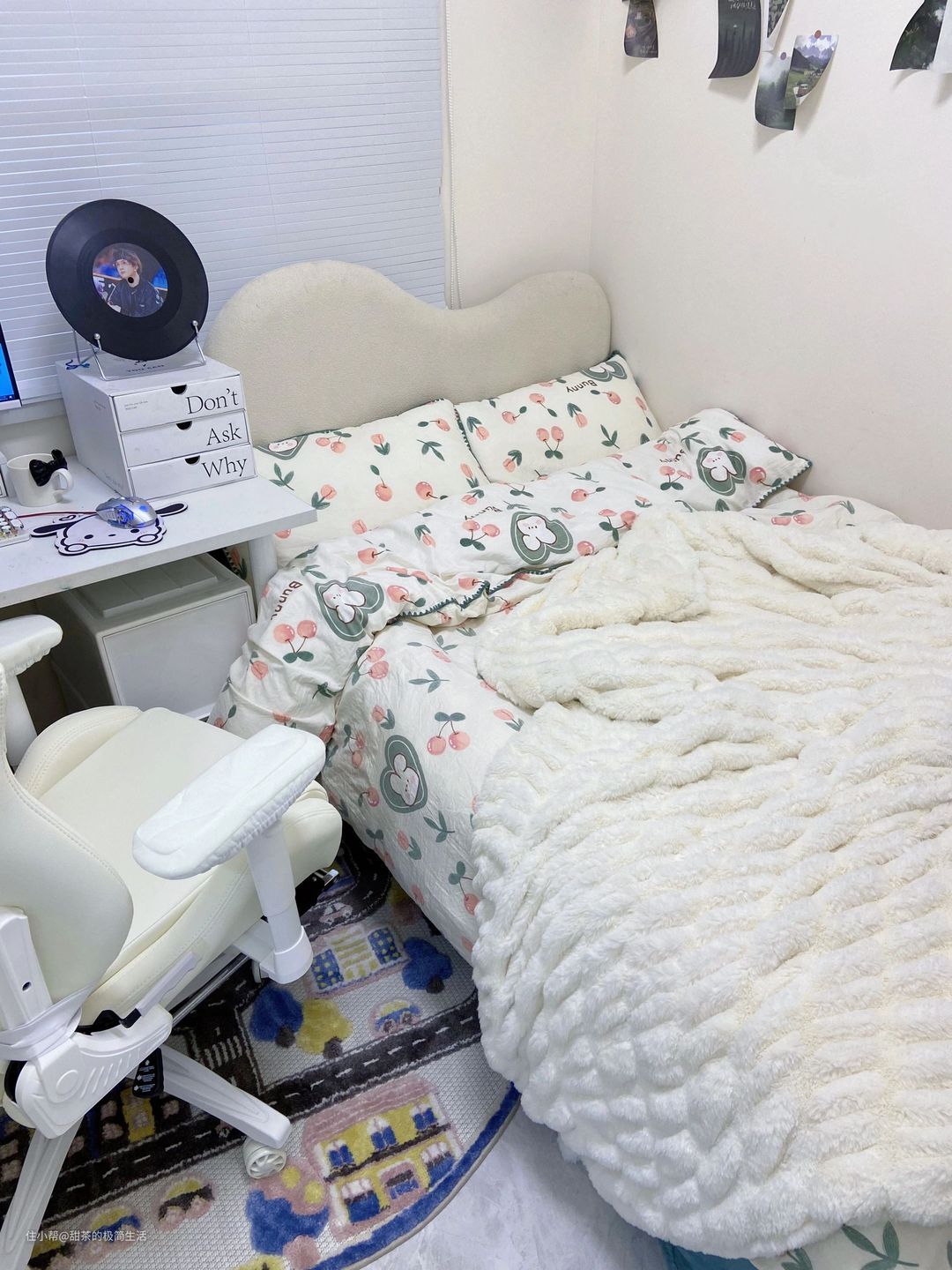 床尾还有一部分空间,布置了斗柜和书桌,提升了卧室的功能性。