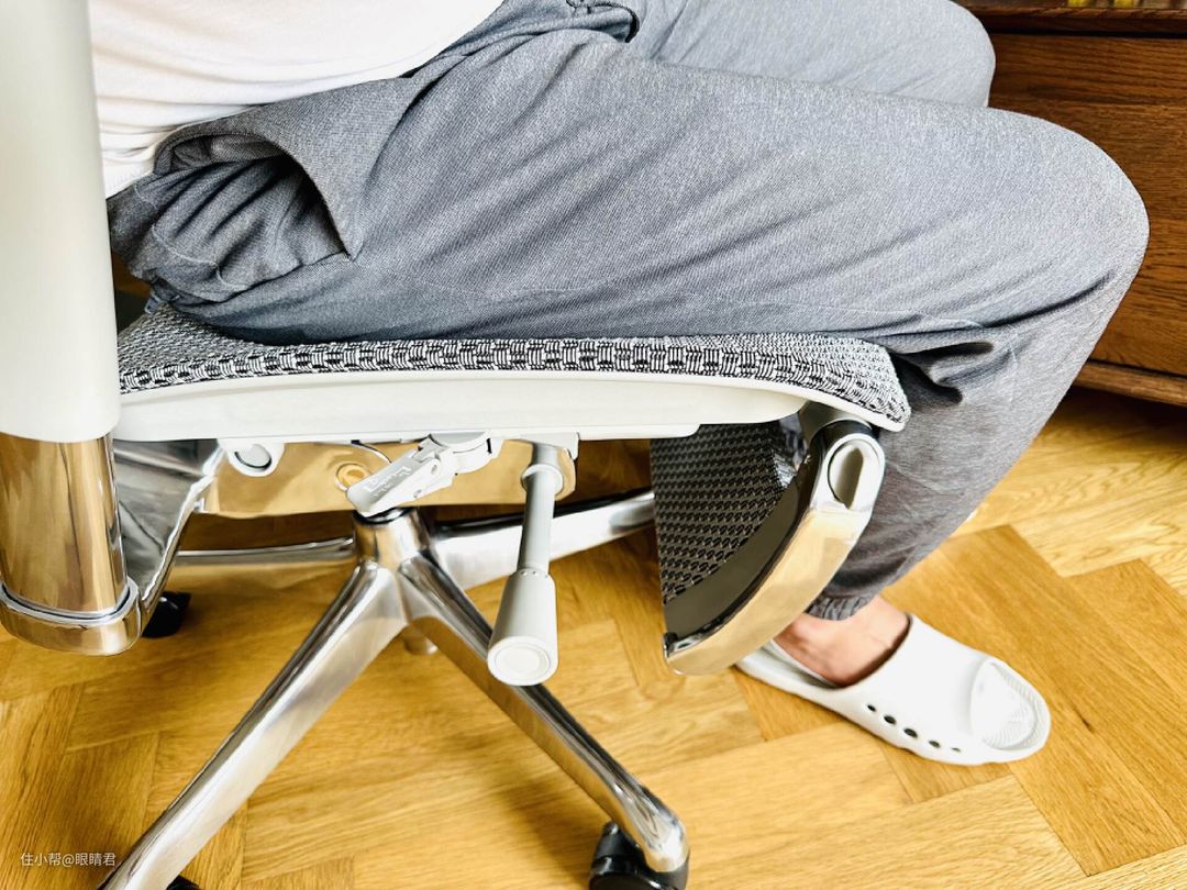 座深5cm可调,不过保友优旗舰W 2的座垫要比我之前的椅子稍微短一些,我172cm的身高,坐深调至最大,膝盖弯刚好能够卡到座垫边缘,短座深搭配大曲率座垫,让保友优旗舰W 2可以适应更多不同身高人群使用,可以说是增强了对身高不足170用户的覆盖。