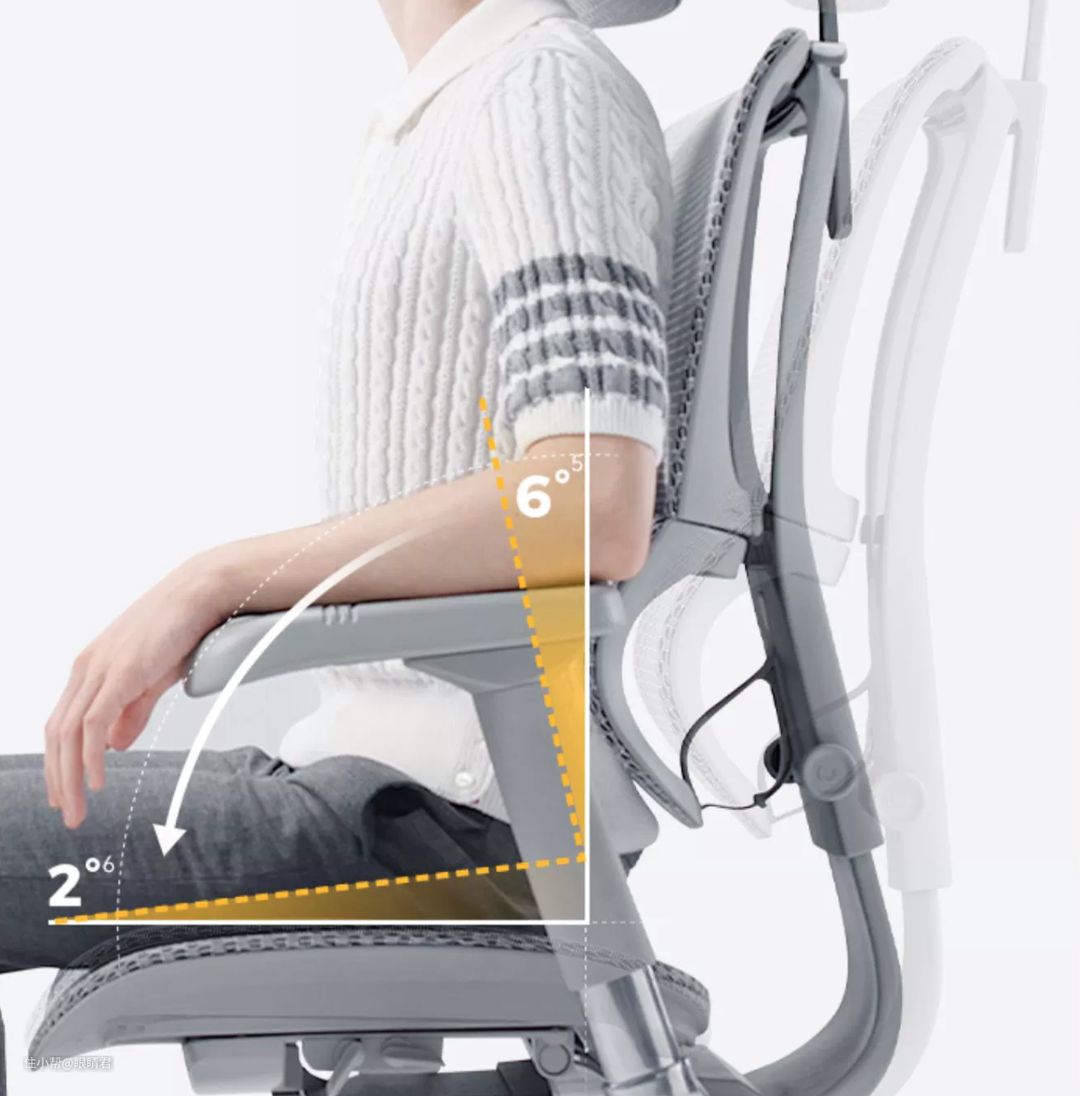 优旗舰W 2的座垫还有一个功能,就是可以跟随椅背前倾,角度不大,但能确保人在伏案办公状态下躯干和大腿呈90°直角,避免盆骨向后倒、脊椎过度弯曲造成的不适感。