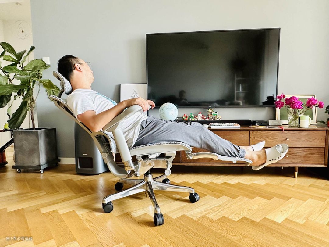 椅背角度支持最大145°调节,提供4档锁定,个人更习惯关闭锁定,平时工作累了或者思路不是那么顺畅的时候,随时可以后躺放松一下。值得一提的是保友优旗舰W 2的超级底座,让后仰的时候整个座垫和扶手都能联动后移,漂移后移躺下后,腿、腰、颈的支撑位置不变,身体各个部位不会因为坐姿改变感觉到拉扯不适感。