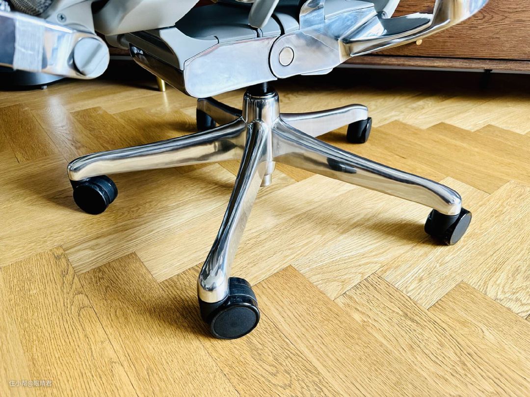 航空级别一体成型铝合金材质的椅脚,做工质感都是一流,搭配加厚PU滑轮,在不同材质地面上都能顺滑自如。