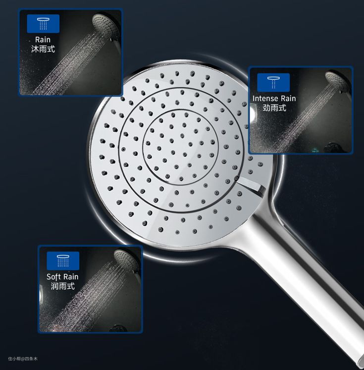 手持花洒带三种出水方式:淋雨、劲雨、润雨,像我有时候感觉身体疲累,就会选择劲雨模式,冲力强一点,有起到按摩身体的作用。花洒是采用一体软硅胶出水口,清洁起来挺方便,而且软管不会缠绕打结,用起来更方便。