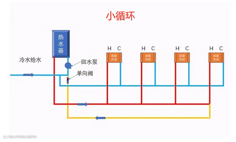各个用水点不需要用热水管支路连接起来,只要很简单布置一根热水管就行,然后在用水点最远端连接回水管,让热水管冷水重新通过回水管回流到热水器里加热实现零冷水。相较于大循环来说,小循环施工更简单一些,成本也更低,但缺点是用水点的热水无法即开即热,需要等一段时间(大概几秒钟),等待热水的时间跟卫生间门口到台盆这段热水支管长度有关。