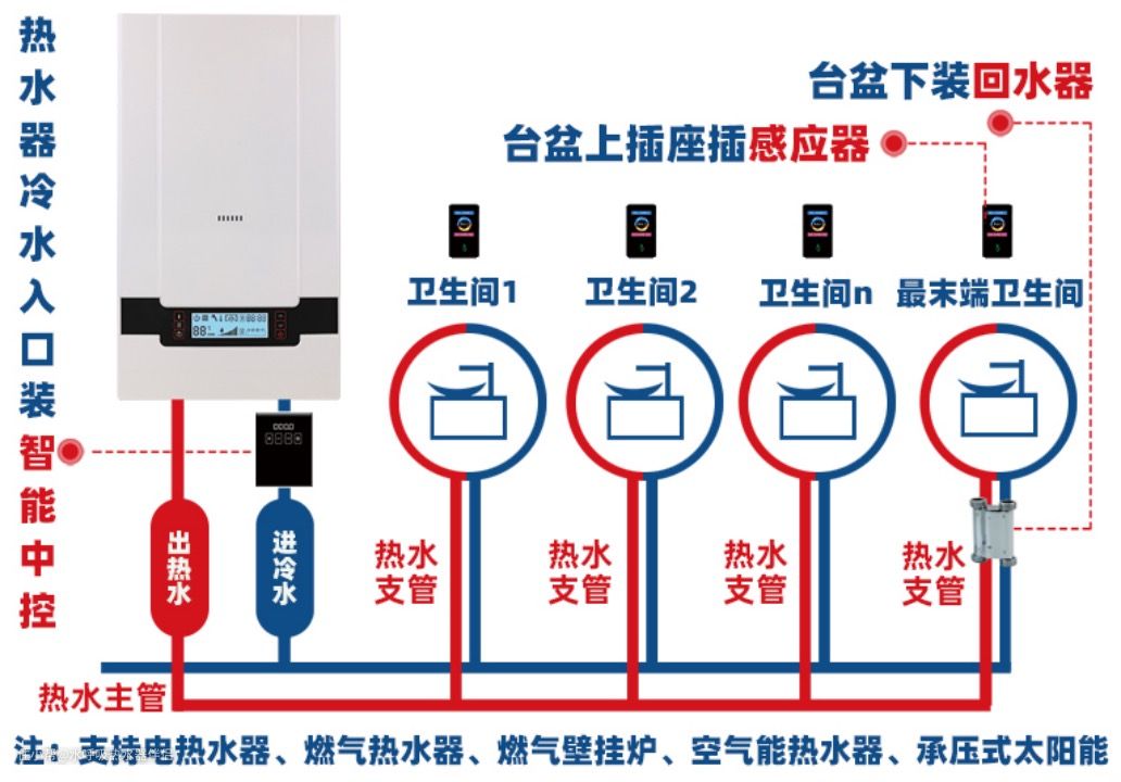 由智能中控+感应器+回水器3个设备组成,中控装热水器冷水进水口,感应器插卫生间插座,回水器装最末端卫生间台盆下连接冷热水管替代回水管做回水。专为没有回水管实现零冷水的家庭设计,新老房即装即用。温控防虹吸回水器,能自动分割冷热水管,保障冷水管内永无高温热水,不伤冷水管。自动感应/手动启动模式,自动感应启动能保障某个时间段内想用热水随时秒出而且还不费电不费燃气,手动启动适合洗澡,需要热水时提前循环,进入卫生间打开花洒即可秒出热水。