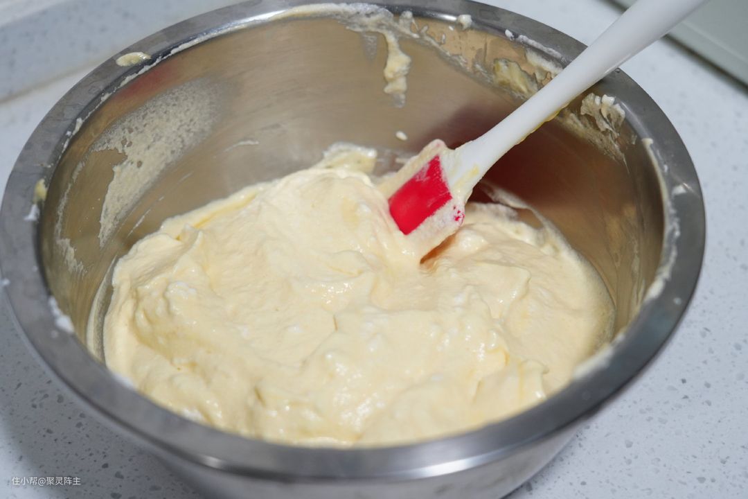 取三分之一蛋白霜倒入蛋黄液中,用硅胶铲翻拌均匀,一定要轻轻翻拌,避免消泡;重复一次后将蛋白液倒入剩下的三分之一蛋白霜中继续翻拌均匀。