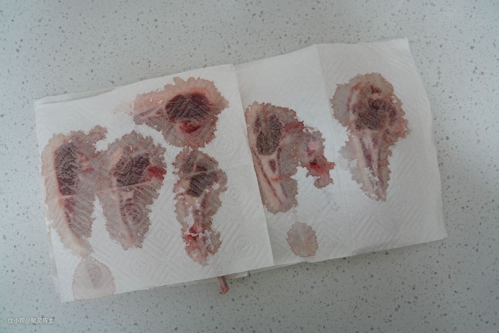 首先将羊排解冻,然后用厨房纸吸去血水。