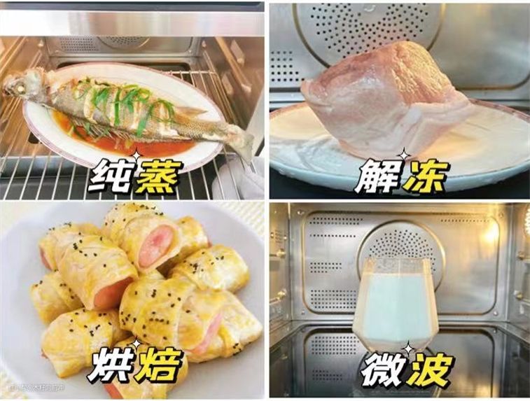 微蒸烤:变频微波+多维蒸汽+烘烤, 先微波快速预热,使食物内外熟透,再纯蒸模式蒸汽补湿,使得食物保持水嫩平衡,之后再进入纯烤模式,快速锁住水分。使得食物外层焦香,烤色形成,香味释放。