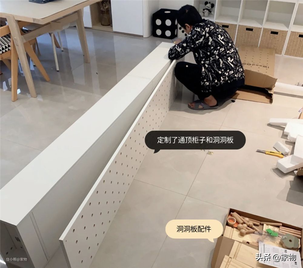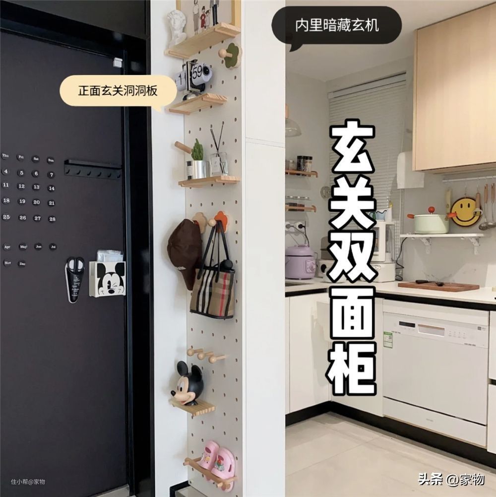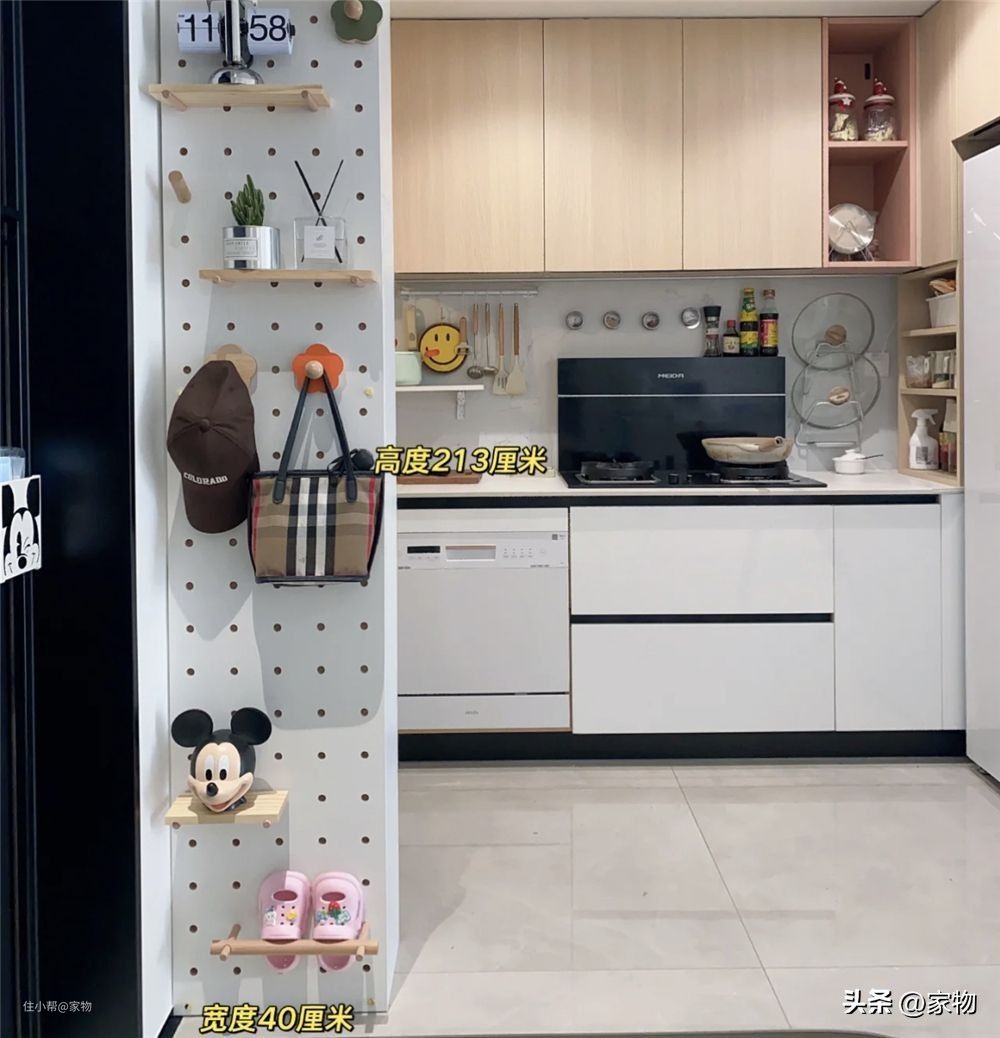 因为墙体厚度有限,为了尽量不影响原本的户型格局,她特意选择了定制柜子,靠内的一面做成了厨房的多层收纳柜,而靠近玄关的这一面,则用洞洞板代替传统柜子,搭配各种小配件,完善了玄关的收纳功能。