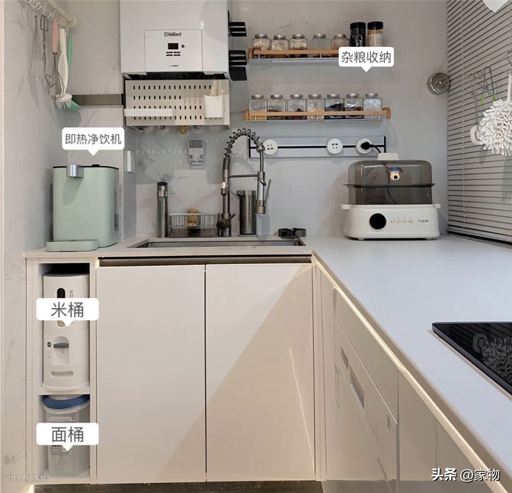 双面柜子的厨房这一侧,则是功能性更大于美观度,它将水槽左侧的收纳空间进行了扩充,原本开放柜这一条纵向空间十分拥挤,但在安装柜子后,瞬间富余了不少。