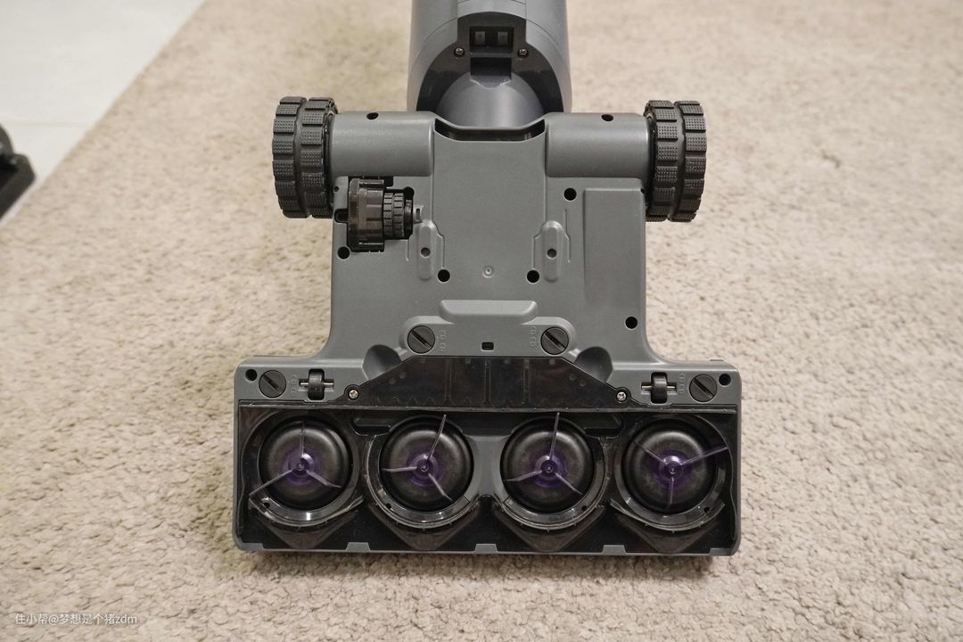 带着这个疑问,我仔细的研究了它的结构,发现和普通的洗地机有一个很大的不同之处,那就是这款洗地机并没有采用常见的滚刷设计,而是用四个PVC材质的地刷代替了滚刷。