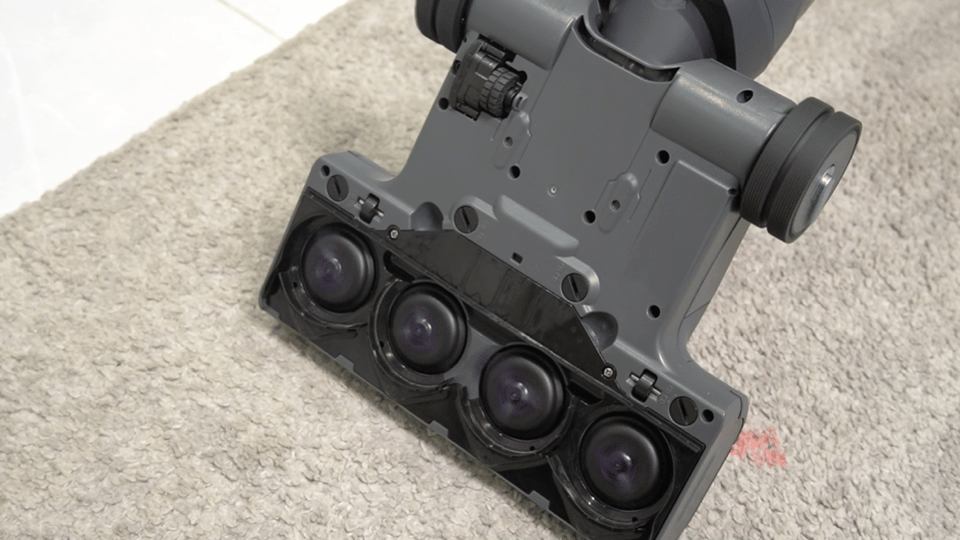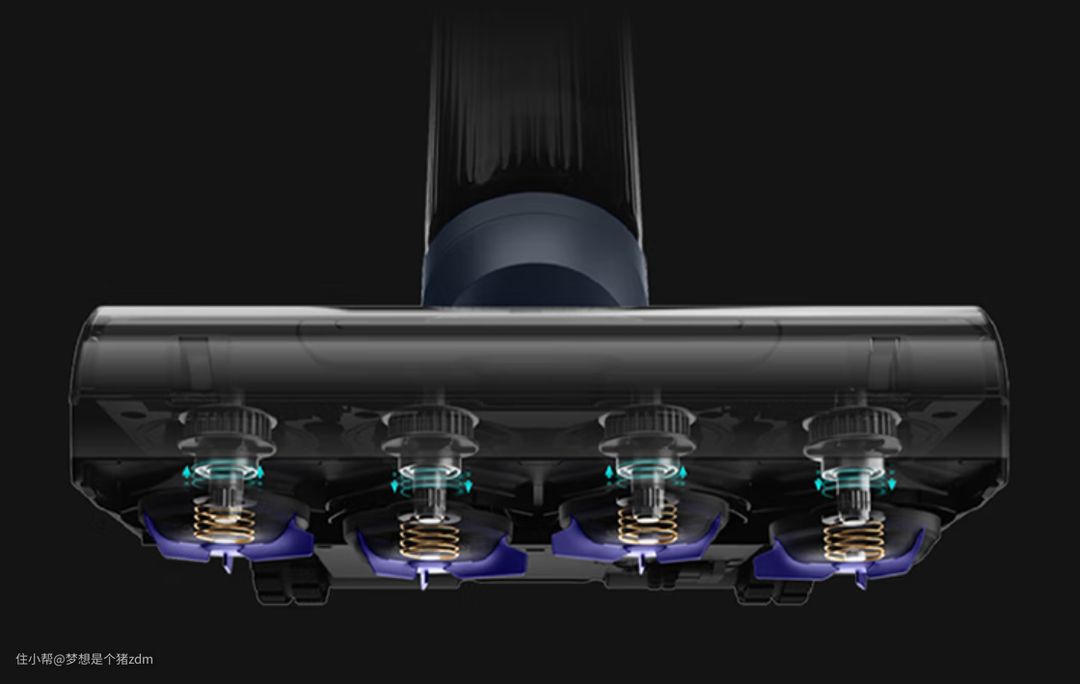 而且这四个地刷并不是简单的固定在机器底部,而是内置了弹力系统,在转动的时候同时还会向地板施加约10N的洗地压力,就相当于我们在使用普通拖把时用力压住拖把拖动一般。另外,因为采用的是悬浮避震结构,所以地刷还能自适应贴合地板,就算地面上有小起伏,地刷同样能很好的贴合做到深度清洁。