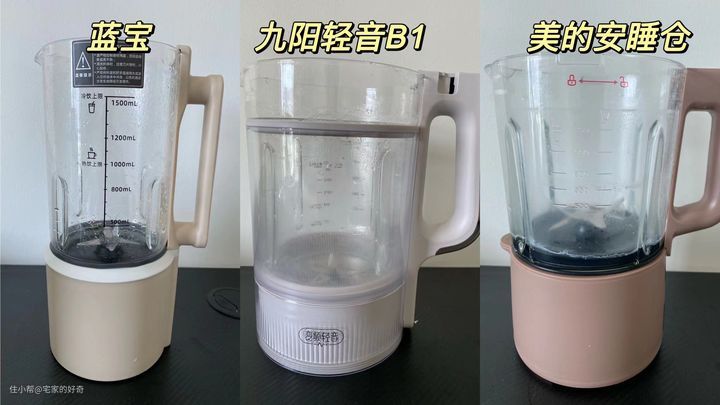 从3台破壁机的结构设计来看,美的和蓝宝都是属于自带隔音罩的静音破壁机,总体体积稍大,呈圆柱形,九阳属于一体式双层隔音杯设计,整体体积较小,外观比较接近于传统破壁机。