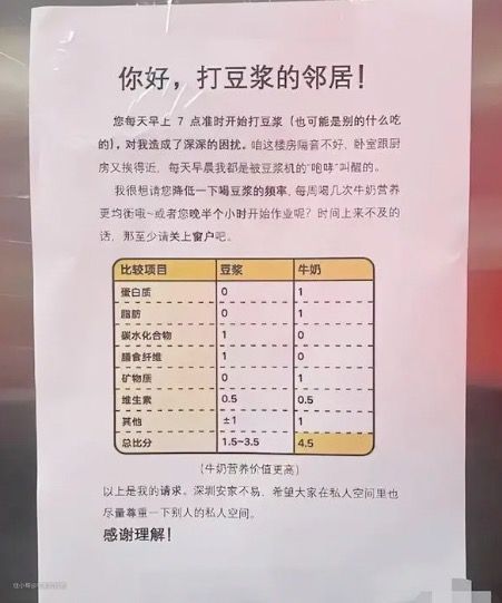 之前在网上就看到过一个像段子又不是段子真实事件,一位小区业主每天都被邻居的豆浆机吵醒,贴公告“建议”邻居改喝牛奶或者关好窗户再用。。