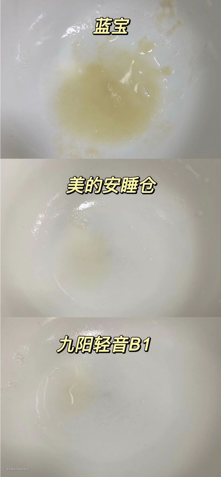 从上面的对比图可以看出,蓝宝破壁机的沉淀物比较明显,美的和九阳B1基本无残渣,在研磨的细腻度表现比较好。然后我再分别品尝了3款破壁机在无过滤情况下,豆浆的味道和口感,比较优秀的是九阳B1打出来的豆浆,特别浓稠,喝的时候感觉不到颗粒的存在,其他两款口感表现也不错。