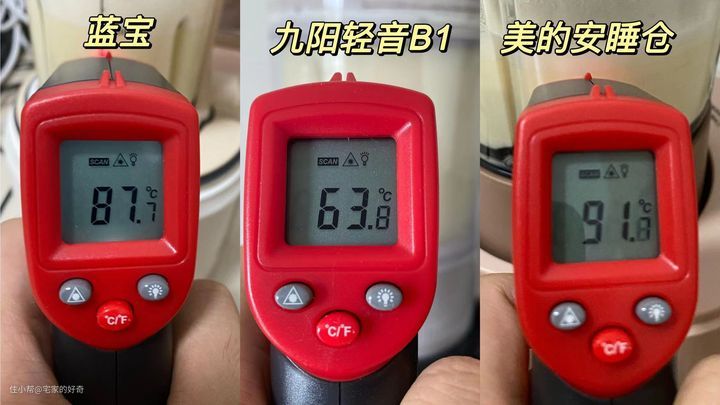 蓝宝和美的的杯体都比较高,在90度上下,在拿取和倒豆浆的时候容易被烫到,九阳的双层杯体隔热效果就比较好,温度在63,不会感觉烫手,安全系数较高,家里有小孩和老人家的用起来就比较放心。