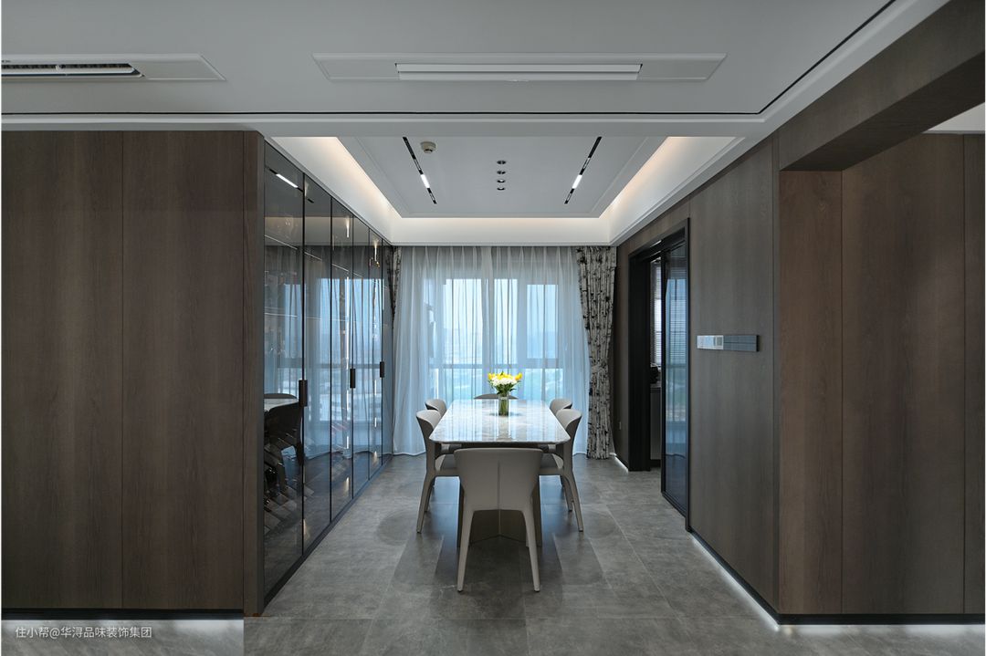 餐厅整体视觉上与大空间风格统一,保持深色基调。白色大理石餐桌搭配了灰白色皮质餐椅,置于餐厅正中间,让生活动线更为便利。一侧背景墙是由嵌入式的定制玻璃柜组成,内置的灯条发出温软的官运,透过茶色的玻璃门,映入眼帘的是业主的藏酒佳酿,整体感觉精致且高级。另一侧则是与厨房连接的玻璃推拉门,潜入在胡桃木色的墙体中,让整个空间显得更加通透明亮。