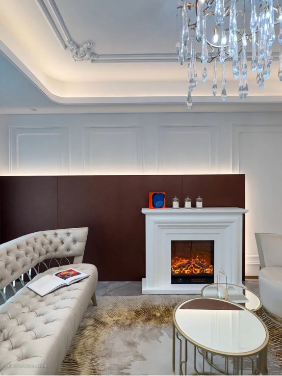 原来放置沙发的地方设计了一个纯白色的壁炉,壁炉的背景护板从壁炉的边缘一直延伸到阳台。灯光效果不仅大气,而且文艺。