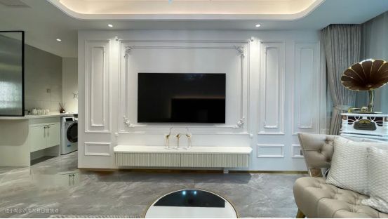 电视背景墙采用PU线条雕花,点缀乳胶漆茬色,化繁为简,保持优雅的法式风格,简单的线条描绘出浪漫的气息。