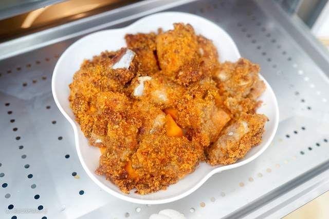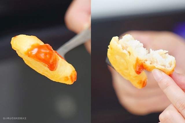 咬一口外皮酥脆,里面肉质嫩嫩的,搭配番茄酱或者酸甜酱更加美味!
