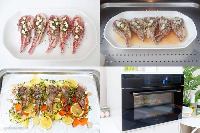 ►小羊排表面抹橄榄油,撒黑胡椒、盐、香草碎和蒜瓣,淋半个柠檬汁,腌制1小时以上。