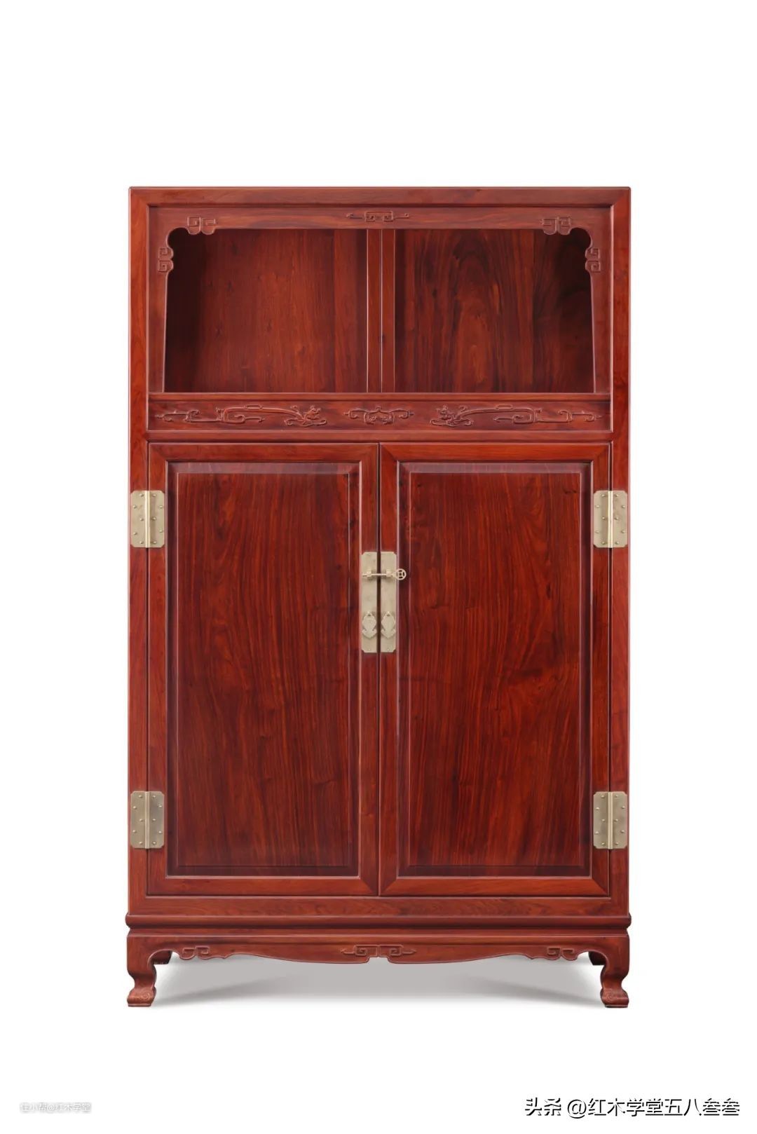 本文图中的这对红木万历柜原物器型来自王世襄《明式家具研究》一书中的上格券口带栏杆万历柜。像这种家具,最大的特点就是它上格下柜的结构,这种家具是格和柜的结合体,是明式家具的经典式样。这里有个知识点要跟大家分享下,亮格柜和万历柜实际上是有区别的,亮格柜和万历柜很像,柜子结构都是上面亮格,下面柜体,但有一点不同,那就是亮格柜和万历柜的腿不同。亮格柜的腿是直腿,柜子的立柱四脚直接落地,而万历柜它最底下要装一个类似有束腰炕几的底座,腿也是有鼓腿彭牙或者三弯腿,像本文图中的万历柜底部就是一个类似几座的结构。