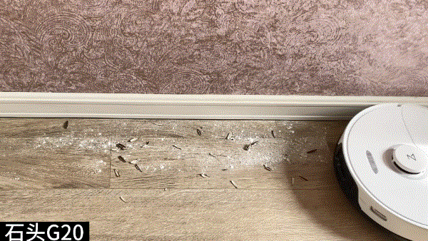 石头G20因为是平板拖布的关系,本身与与墙面之间的卫生死角就会小一些,所以即便直行也基本能将污渍扫拖干净。