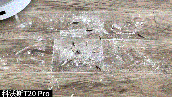 测试一:首先是沿墙边的扫拖测试,我模拟了一些面粉和瓜子皮,科沃斯T20 Pro一边转动机身一边扫拖,没有任何遗漏,表现非常不错。