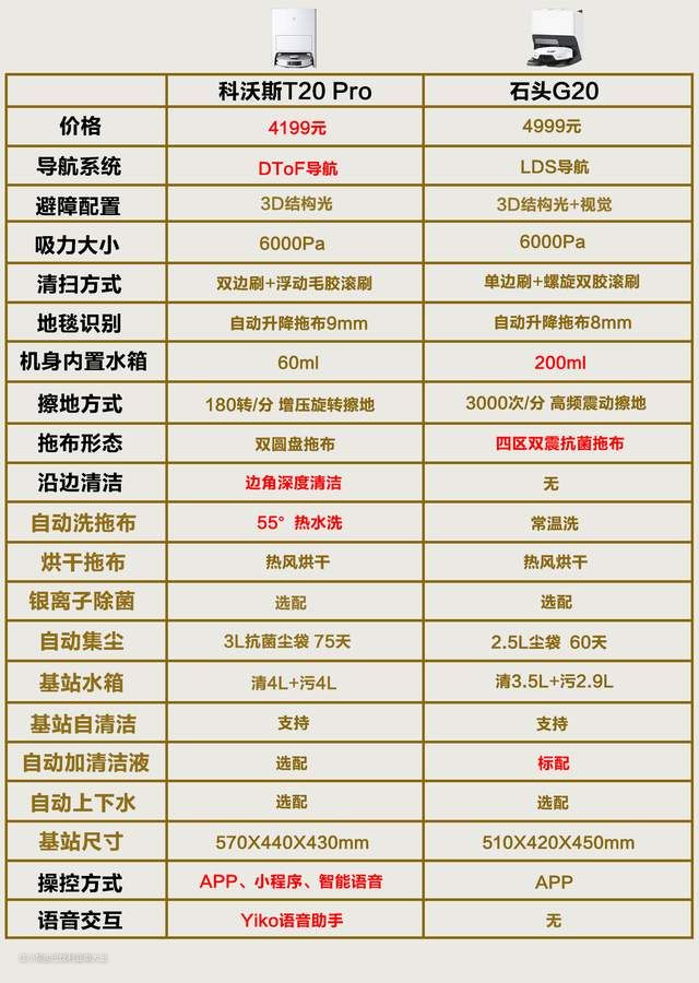 通过数据对比,首先可以看到价格方面:科沃斯T20 Pro售价更低,便宜了近一千块钱。