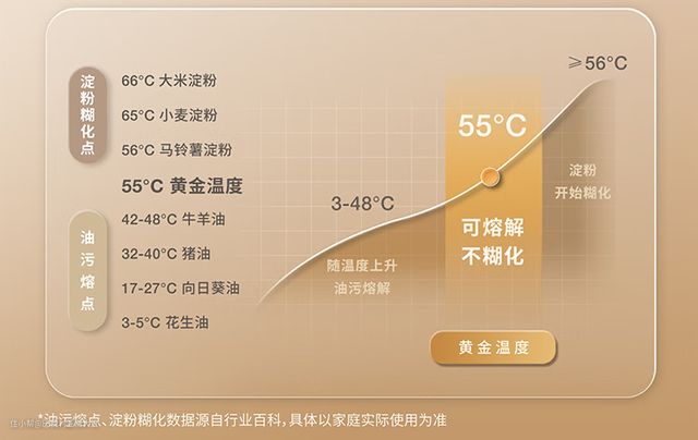 55°C是有实验数据支撑的黄金洗涤温度,既可以溶解大部分油渍污渍,又不至于使淀粉类污渍糊化产生粘性,越洗越不干净。