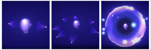 我们在电影院,要实现360度环绕的声场,是通过在影厅的四面(包括幕布后面也有音箱)与天花板布置音箱,这是通过物理方式实现的。