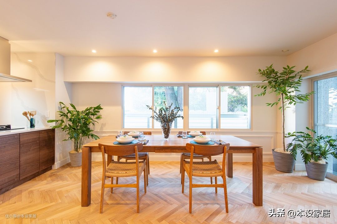 从玄关看餐厅,精致的人字拼木地板,搭配大白墙,再加上充足的采光,看起来清爽又治愈。