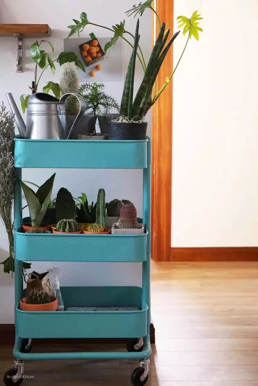 和绿植最搭的还是蓝色的推车,可移动的小花园。可以轻松照顾到每一层,比如冬天的时候要推到阳光下晒晒太阳,夏天的时候又要拿到阴凉处,再也不用一盆盆植物搬来搬去了!
