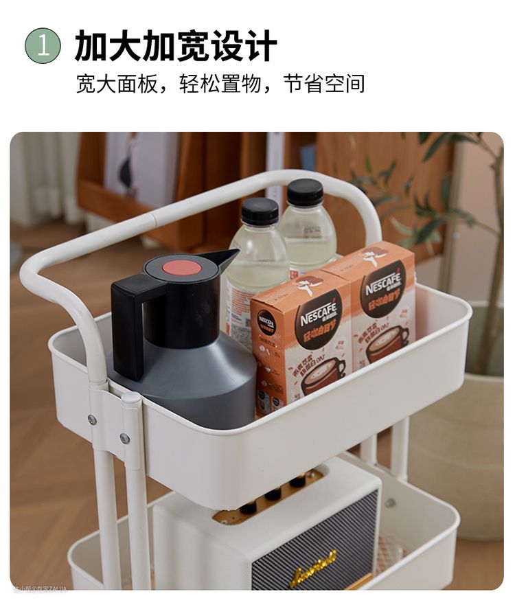 第一,它个子小,移动方便,可以按自己的想法随意更换位置进行摆放,利用小推车进行收纳,家里可以减少很多卫生死角,因为它移动方便,卫生打扫也很是方便。