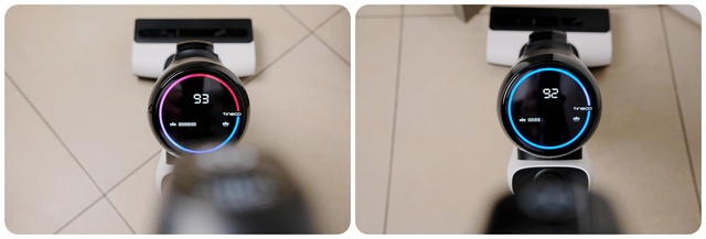 在清洗地面时往前推行的时候地面比较脏,机器识别为重污渍(屏幕红色显示),而在往回拉的时候,地面已经变的比较干净了,所以机器上的显示屏,会从红色变为蓝色。