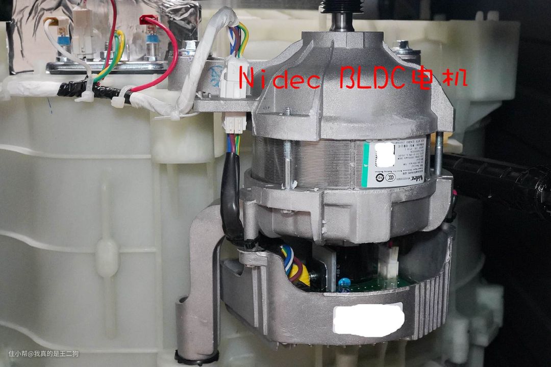 电机来自专业厂家Nidec,一家很知名的日本专业电机厂家,可见Twinwash町渥的用料方面还是很扎实可靠的。铭牌可以看出,脱水的最高转速可达14000转/分钟,衣物的脱水速度还是很有保障的。