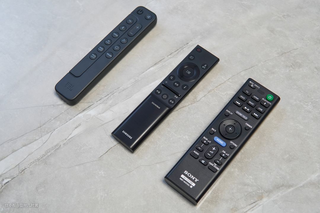 ▲就外观而言,我觉得JBL BAR 1000方正、圆润、瘦长的造型最是不错;三星HW-Q990C的外观也跟当下的主流遥控器设计理念一致,质感上会逊色于JBL;索尼HT-A5000的遥控器更像是个上世纪的产物,相对比较土气。