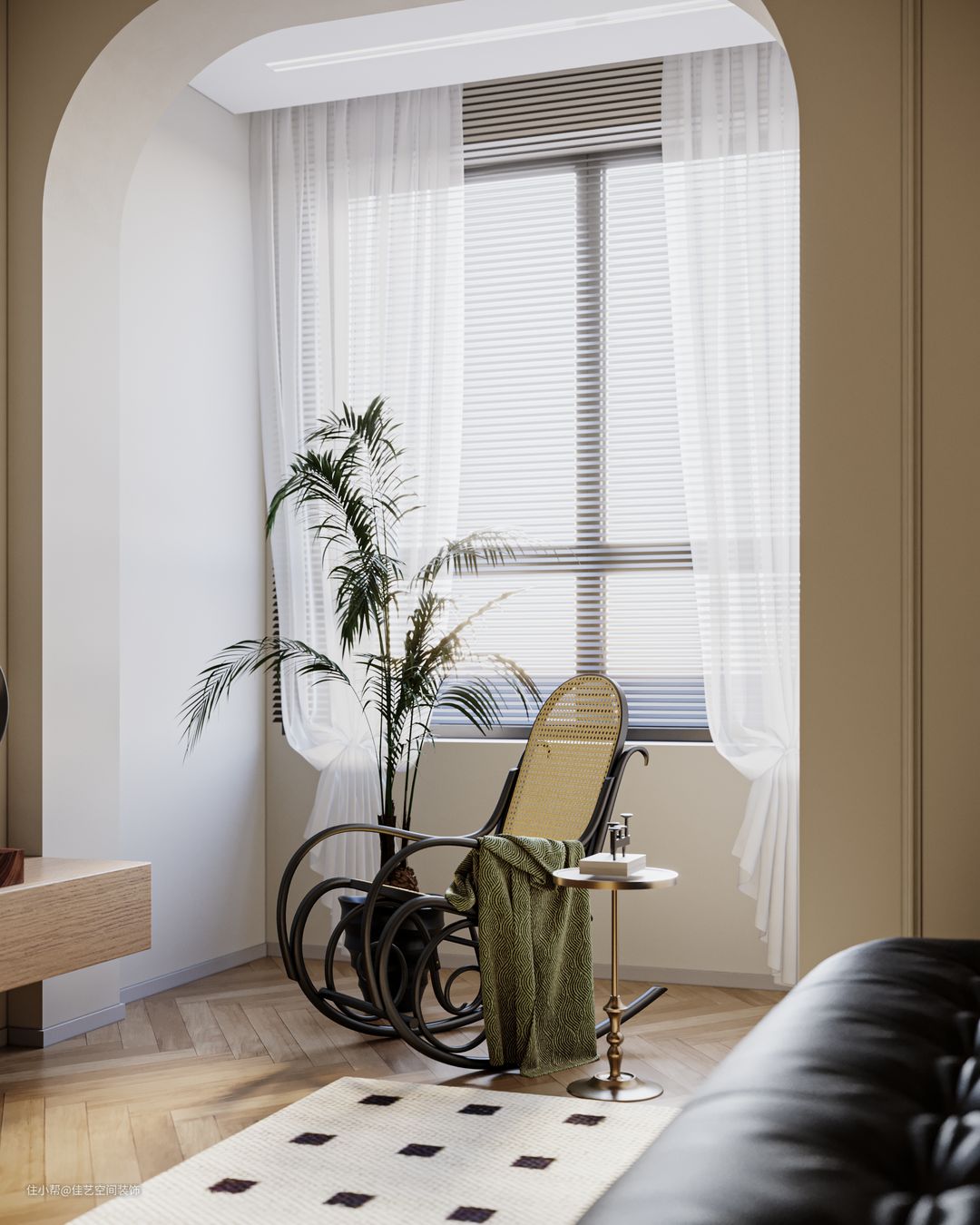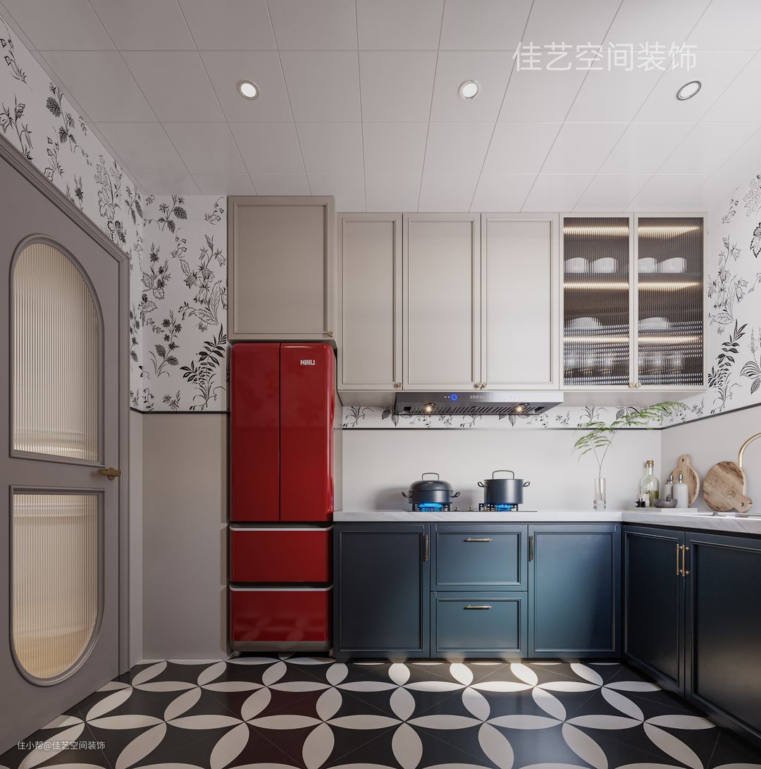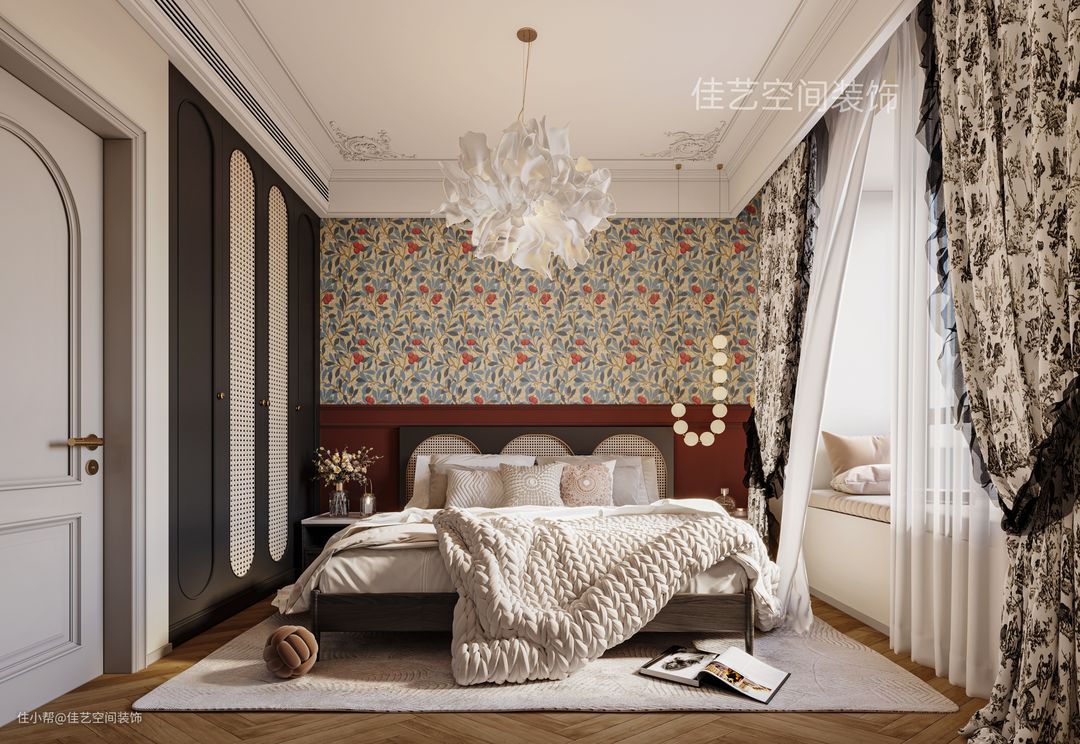 焦糖色地板、红墙床头背景搭配小碎花壁布、黑色衣柜,集齐这些深色系装饰 ,复古风就有模有样啦 ,墙面、顶面用奶油白做主色调,避免了深色系的压抑,又能避免大白墙的廉价感。 卧室、阳台过道都做成了拱形门洞,精致又显复古调调。